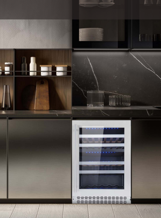 Полки из дерева обеспечивают безопасное размещение бутылок, а мягкая светодиодная подсветка придает шкафу элегантность.