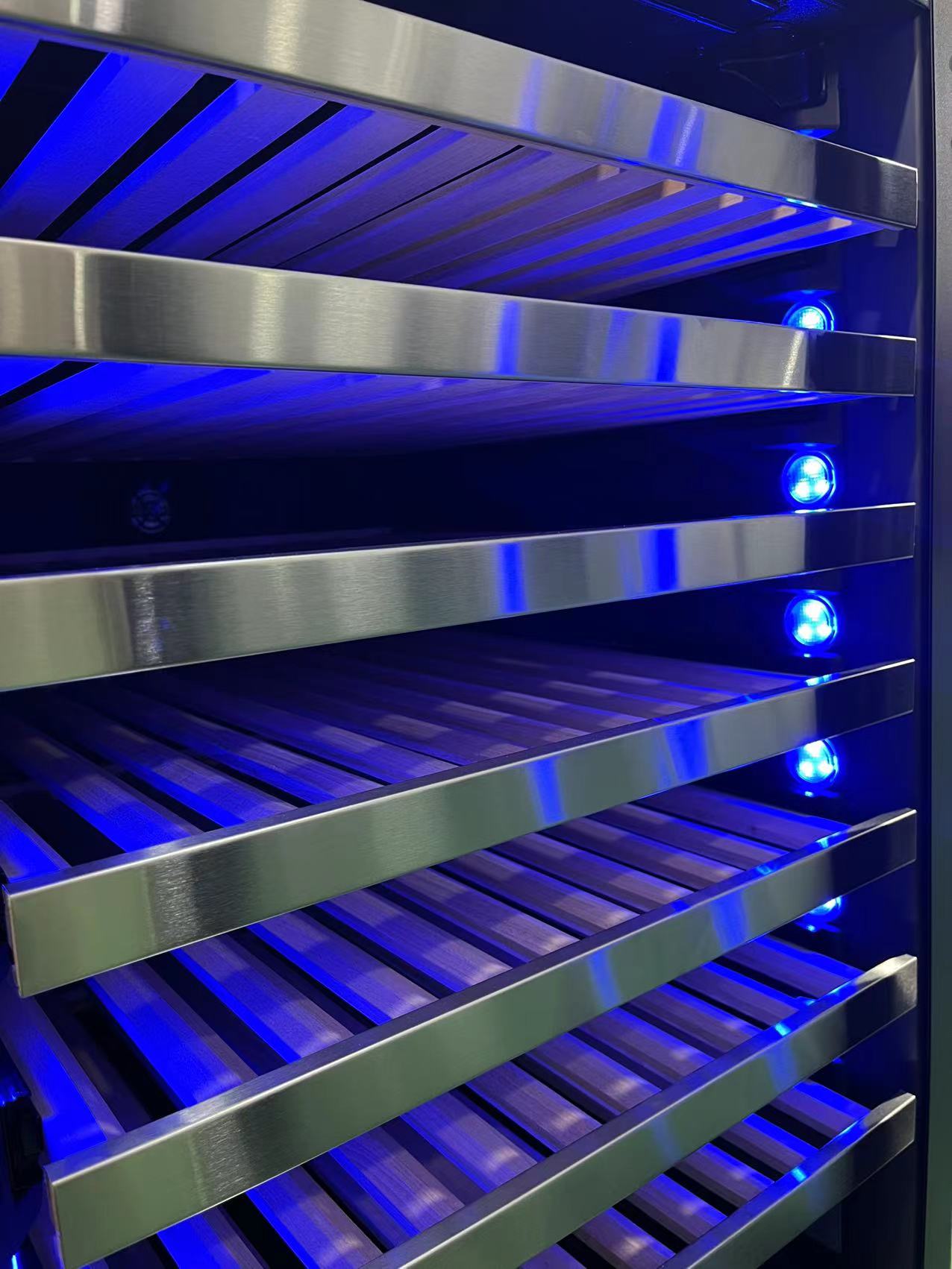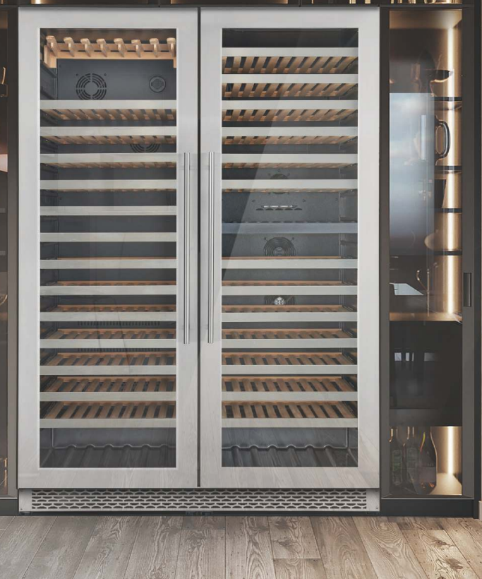 Ультрафиолетовая тонировка стеклянной двери защищает вина от воздействия вредных лучей солнца, продлевая срок их жизни и улучшая вкус. Размещайте вино на безопасных деревянных полках под мягкой светодиодной подсветкой.