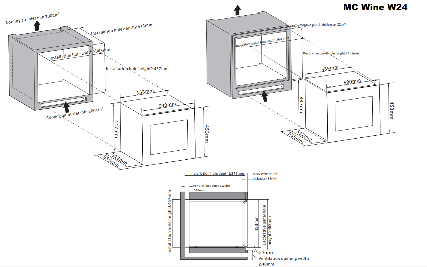Перед установкой винного шкафы, убедитесь, что указанные в инструкции показатели напряжения (В) и частоты (Гц) совпадают с уровнем показателей в Вашем доме; При транспортировке и установке не наклоняйте винный шкаф более чем на 45°; Не устанавливайте винный шкаф вблизи с нагревающимися электроприборами, а также под прямыми солнечными лучами; При установке с помощью ножек отрегулируйте винный шкаф по уровню и убедитесь в наличии необходимых зазоров между дверью и мебельными фасадами, чтобы не повредить их.MC Wine оставляет за собой право изменять параметры без предварительного уведомления.